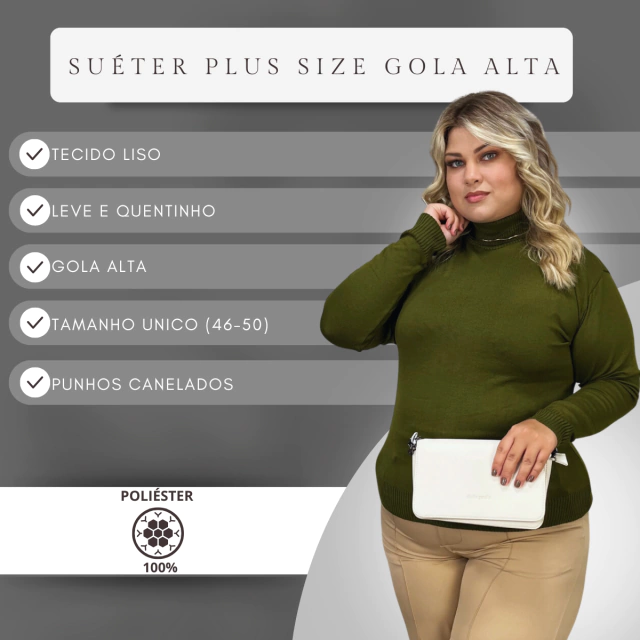 - O Suéter Feminino Gola Alta é a opção perfeita para quem deseja aliar elegância e versatilidade sem abdicar do conforto. Seu design clássico se adapta a diferentes ocasiões, permitindo composições que vão do casual ao sofisticado.