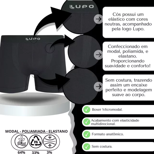 - A Cueca Modelo Boxer Fabricada pela Lupo em Micromodal Tecido de Desenvolvido com a mais Alta Tecnologia, Sem costura, Diminui os pontos de Fricção;